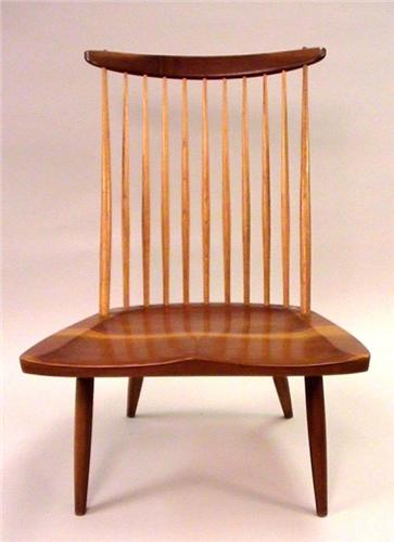 A GEORGE NAKASHIMA CHERRYWOOD "NEW" LOUNGE CHAIR WITHOUT ARMS; With drawing and original receipt dated May 24, 1965, Spindle-back, saddle seat four splayed legs with cushion upholstered in red velvet, 33"h x 21-1/21" x 18"