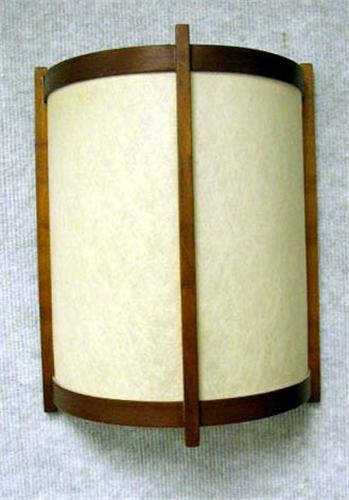 A GEORGE NAKASHIMA CHERRYWOOD WALL SCONCE; Dated 1962, half cylindrical shade with parchment liner, and holly rings, 12"h