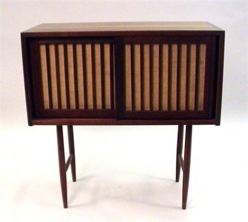 A GEORGE NAKASHIMA WALNUT CABINET ON FOUR LEGS WITH GRASS CLOTH DOORS; Interior with one adjustable shelf, Circa 1955, 33-5/8"h x 33" x 16"