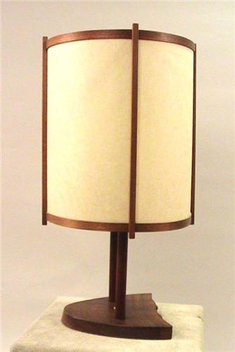 A GEORGE NAKASHIMA WALNUT TABLE LAMP WITH TRIANGULAR BASE; Circa 1965, cylindrical shade with parchment liner and holly rings 29"h X 15"dia.