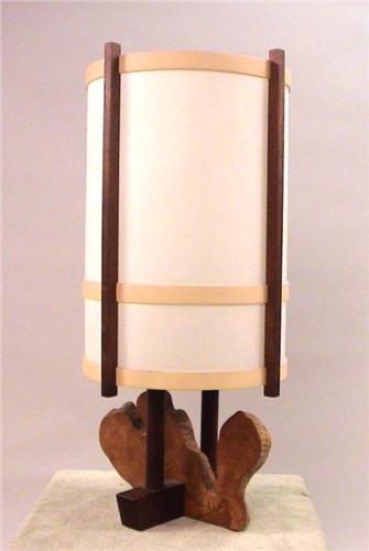 A GEORGE NAKASHIMA WALNUT TWO-POST TABLE LAMP; Cylindrical shade with parchment liner and holly rings, 26-1/2" x 13"dia.
