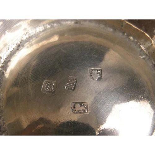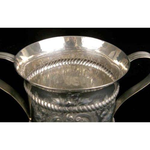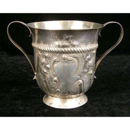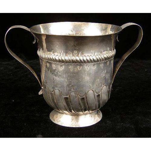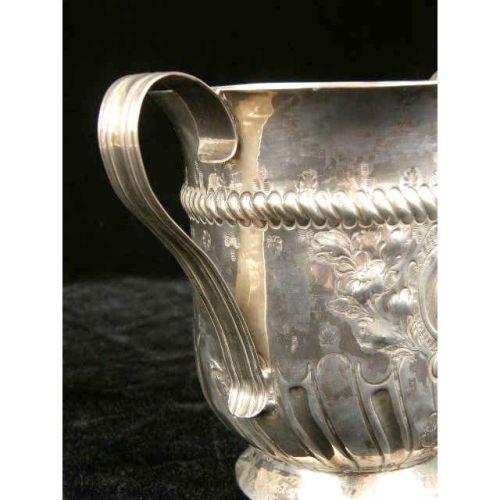 A GEORGIAN ENGLISH SILVER CAUDLE CUP<BR><BR>Hallmarked I.D., London, 1770, fluted horizontal band, repousse floral and scroll decoration, on circular foot, 5"high x 7-1/2" over handles, weight apx. 6 T.O.