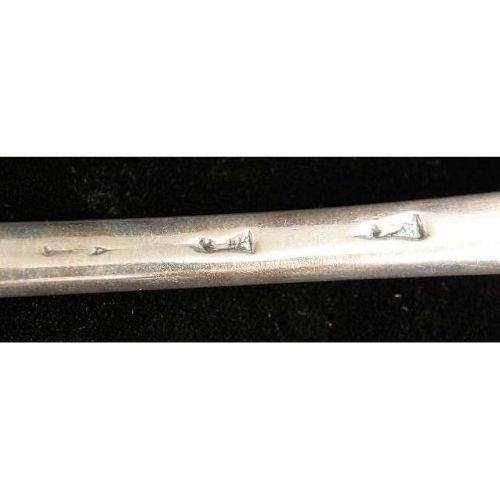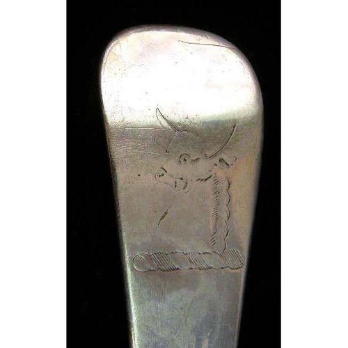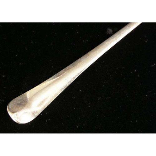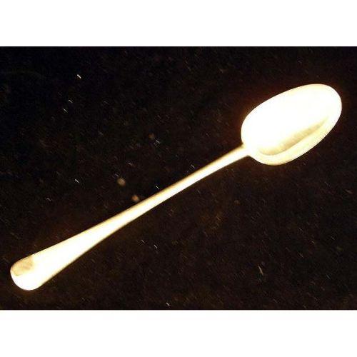 A GEORGIAN ENGLISH SILVER HANOVERIAN PATTERN STUFFING SPOON<BR><BR>Crested, illegible hallmarks, 15"long, weight apx. 7 T.O.