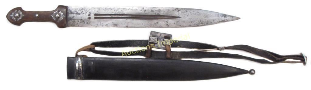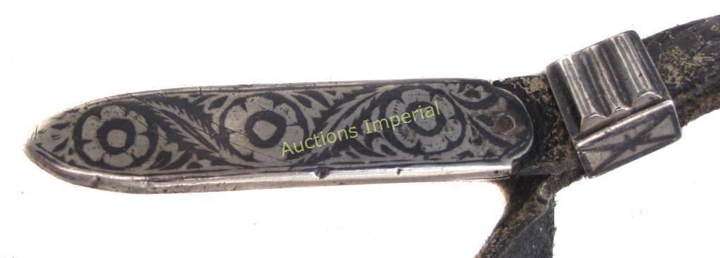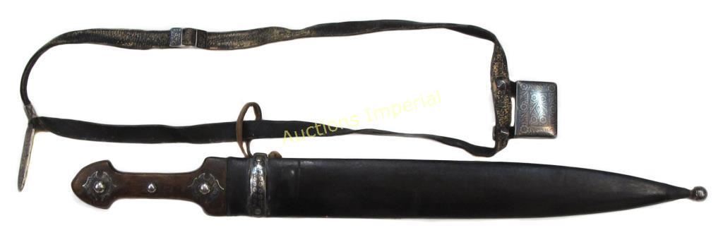 A massive example, with horn grips and intricately engraved and nielloed silver mounts. The long, bifullered blade struck at the forte with a pair of maker’s marks. In its leather-covered wooden scabbard with en suite nielloed silver mounts Retains its rare original matching belt with nielloed silver mounts including a match safe. Latter 19th century. Leather replaced, blade with areas of minor pitting. Overall length 60 cm.
