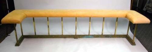 A GEORGIAN STYLE LEATHER-UPHOLSTERED BRASS CLUB FENDER; Of impressive size, with square supports and molded plinth 22"h x 8'2"w x 26"d