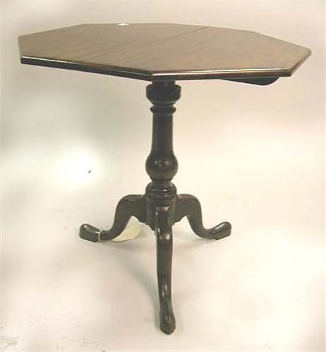 A GEORGIAN STYLE MAHOGANY OCTAGONAL TOP TEA TABLE, raised on vase-form standard resting on tripod base with snake legs, 29"dia. X 28"h