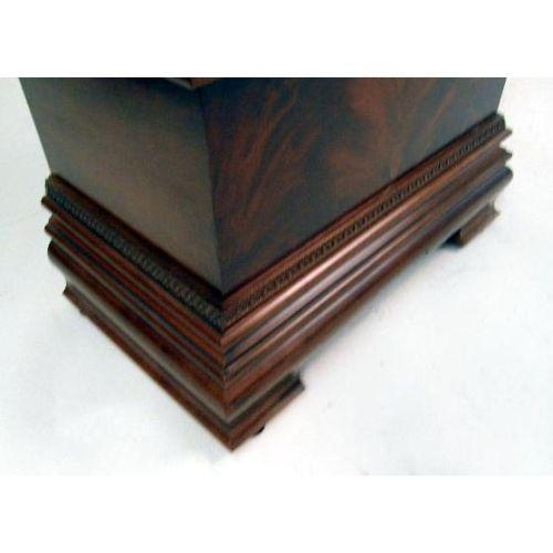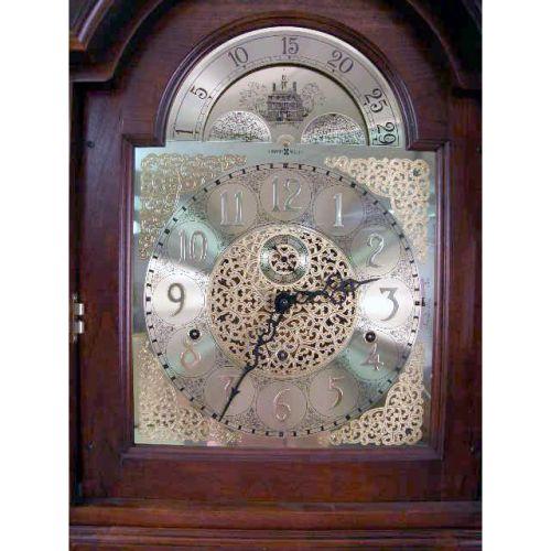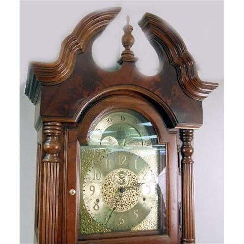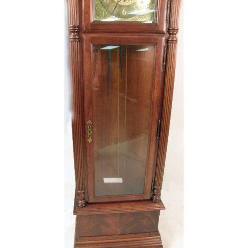 A GEORGIAN STYLE MAHOGANY TALL CASE CLOCK<BR><BR>Manufactured by Howard Miller, broken arched crest over glazed door opening to a gilt base above a glazed door revealing brass weights and large pendulum, resting on short bracket feet, 83"h