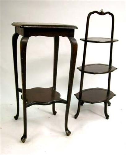 A GEORGIAN STYLE MAHOGANY THREE-TIER STAND; Together with a Queen Anne style mahoganized side table 34"h