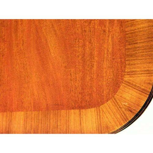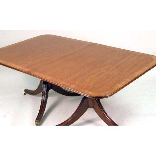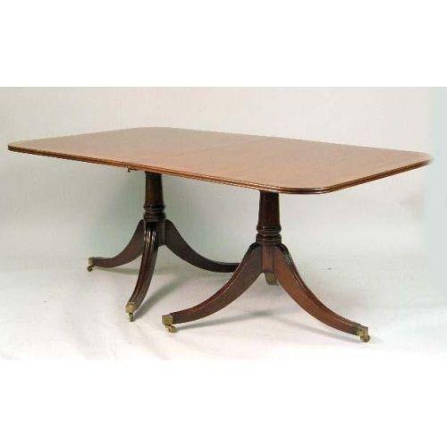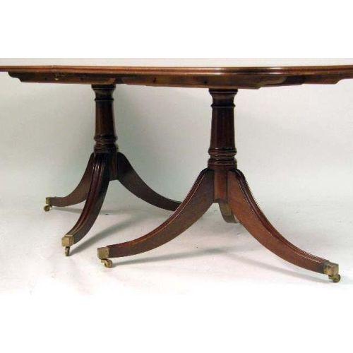 A GEORGIAN STYLE TWIN PEDESTAL MAHOGANY DINING TABLE<BR><BR>In two sections, expanding to accommodate a large single leaf, each section, 29" x 36" x 42"w