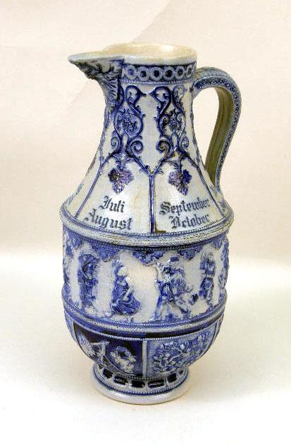 The body of the krug incised with the twelve months of the year, and depicting peasants in seasonal pursuits. The pour spout in the shape of a face. 12 3/4"h Old chip to base.