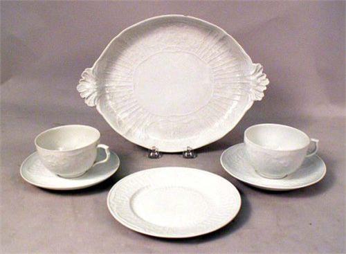 Royal Factory, comprising eleven plates, thirteen saucers, fourteen cups, and a serving plate. Chips.