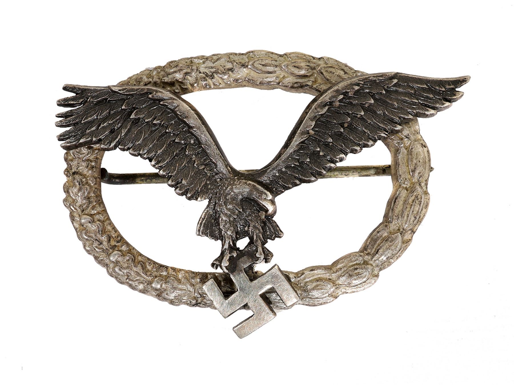 Luftwaffe 1st Model Pilot/Observer Badge, executed in silver wreath with oxidized spread wing eagle, C.E. Junker Berlin marked.