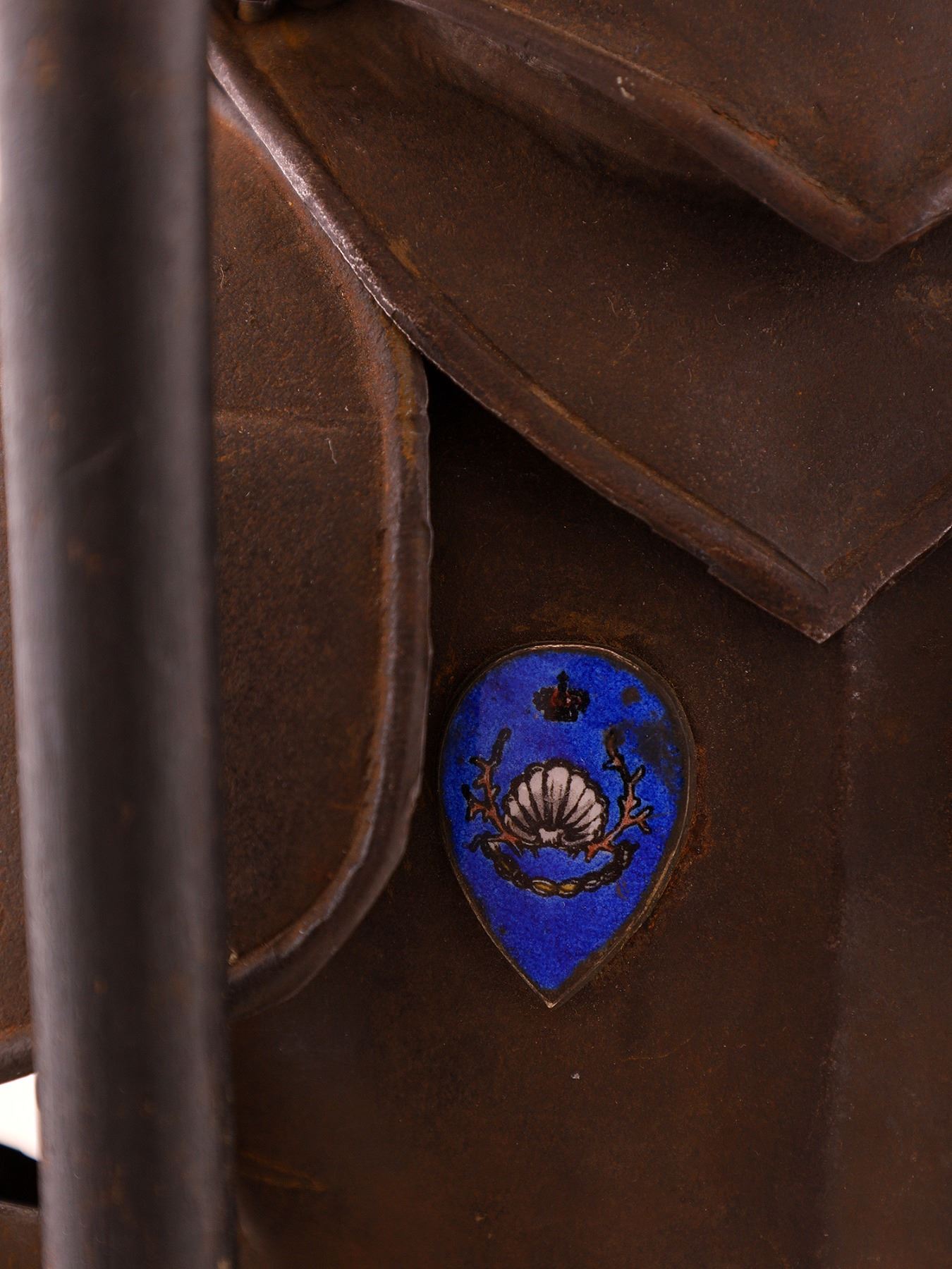 A finely made miniature suit of armor holding a halberd, with an enameled shield and breastplate, atop a wooden base.