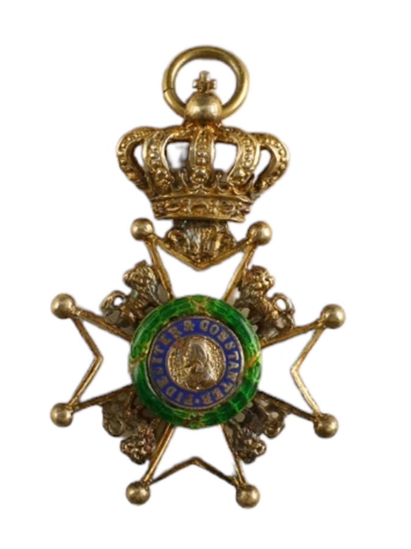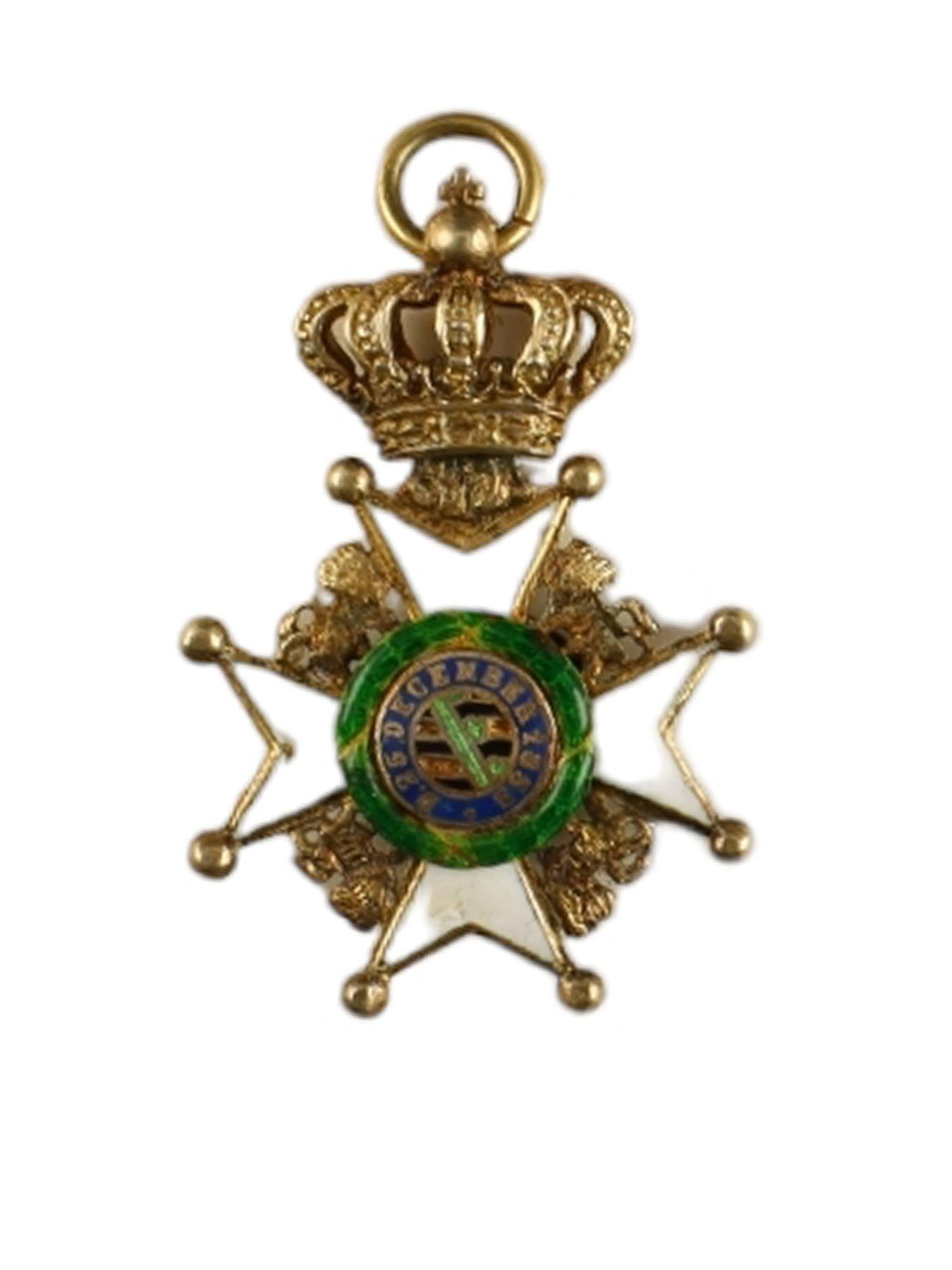 A pre-1935 miniature Saxe-Ernestine House Order medal consisting of silver-gilt along with white, blue, and green enamel. The front bears the text "Fideliter & Constanter" meaning "Faithful & Steadfast". The reverse bears the text "25 December 1833" which was the date of the establishment of the order.