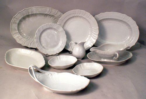 Marked on the underside Royal Factory, with a basket weave rim, comprising twenty-two dinner plates, twelve each lunch plates, rim soup bowls, dessert plates, bread and butter plates, handled cream soup bowls with saucers, demi-tasse cups and saucers, and