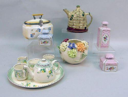 Having a floral motif, and hinged lid, marked underside "Germany". Together with a porcelain tea service for two, comprising a teapot, a cream jug, a sugar bowl, two cups, fitted on a tray, three porcelain vanity jars, inscribed underside "Parisienne", a porcelain vase with applied flowers and an earthenware beehive teapot, inscribed "And the Potter said Bee Ware!/J. Huntley."