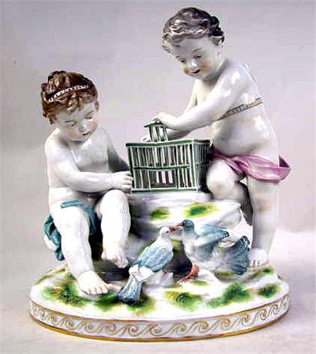A GERMAN PORCELAIN FIGURAL GROUP DEPICTING TWO CUPIDS RELEASING BIRDS; Some damage and repairs