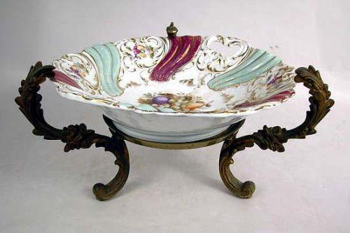 A GERMAN PORCELAIN GILT FLORAL AND FRUIT DECORATED DOUBLE HANDLED SERVING DISH; Mounted on a patinated metal stand 12"diameter x 6"h