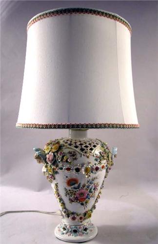 A GERMAN PORCELAIN VASE MOUNTED AS A LAMP; Body decorated with applied flowers and female masks, 14" x 8"