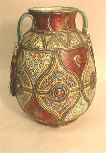 A GERMAN SILVER AND TOOLED LEATHER-DECORATED DOUBLE-HANDLED EARTHENWARE CROCK; 16"h