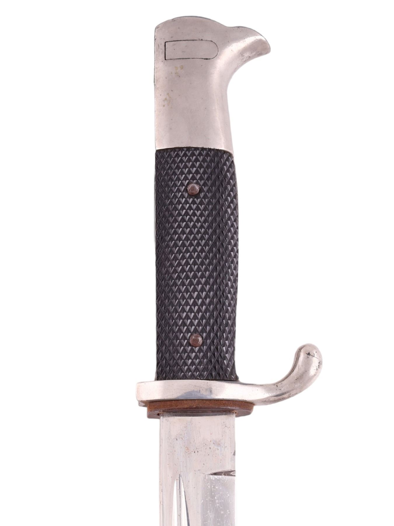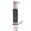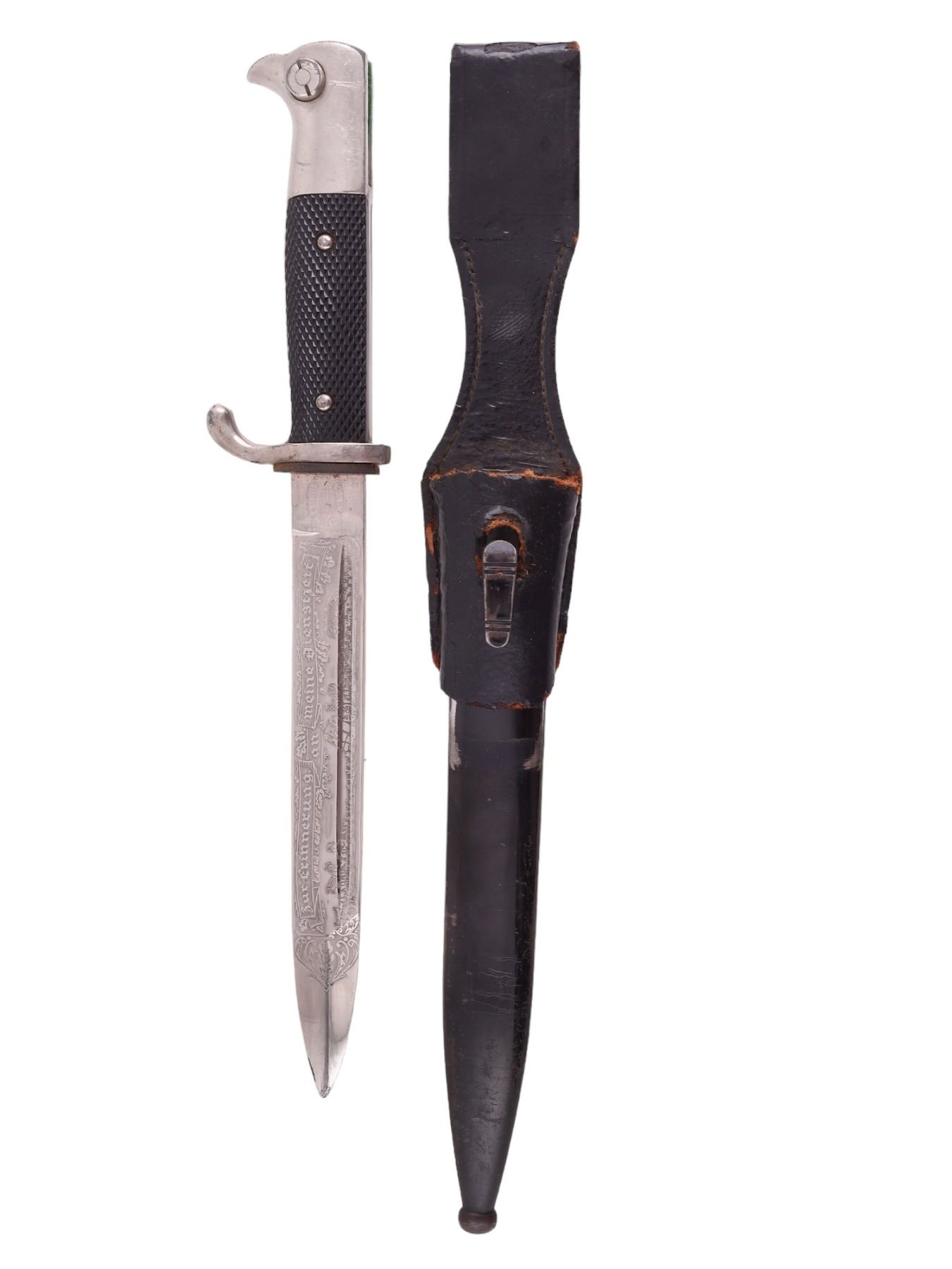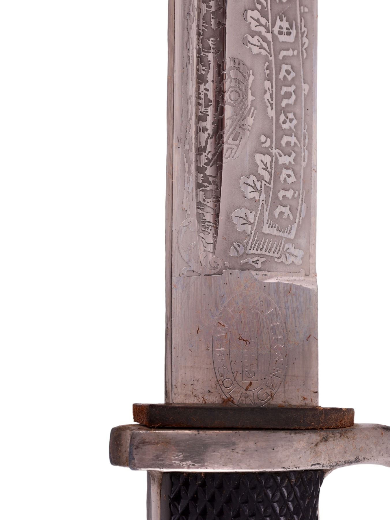 This Nazi German K98 Dress Bayonet is in fantastic shape. The scabbard and the leather frog both exhibit signs of wear consistent with use and age, but the blade is in near mint condition. The blade has a beautiful engraving showing German soldiers and military equipment, as well as the text 'Zur Erinnerung an Meine Dienstzeit' meaning 'As a Reminder of My Time in Service'. The maker's mark attributes this dagger to F.W. Holler of Solingen, and shows their trademark vertical thermometer logo.