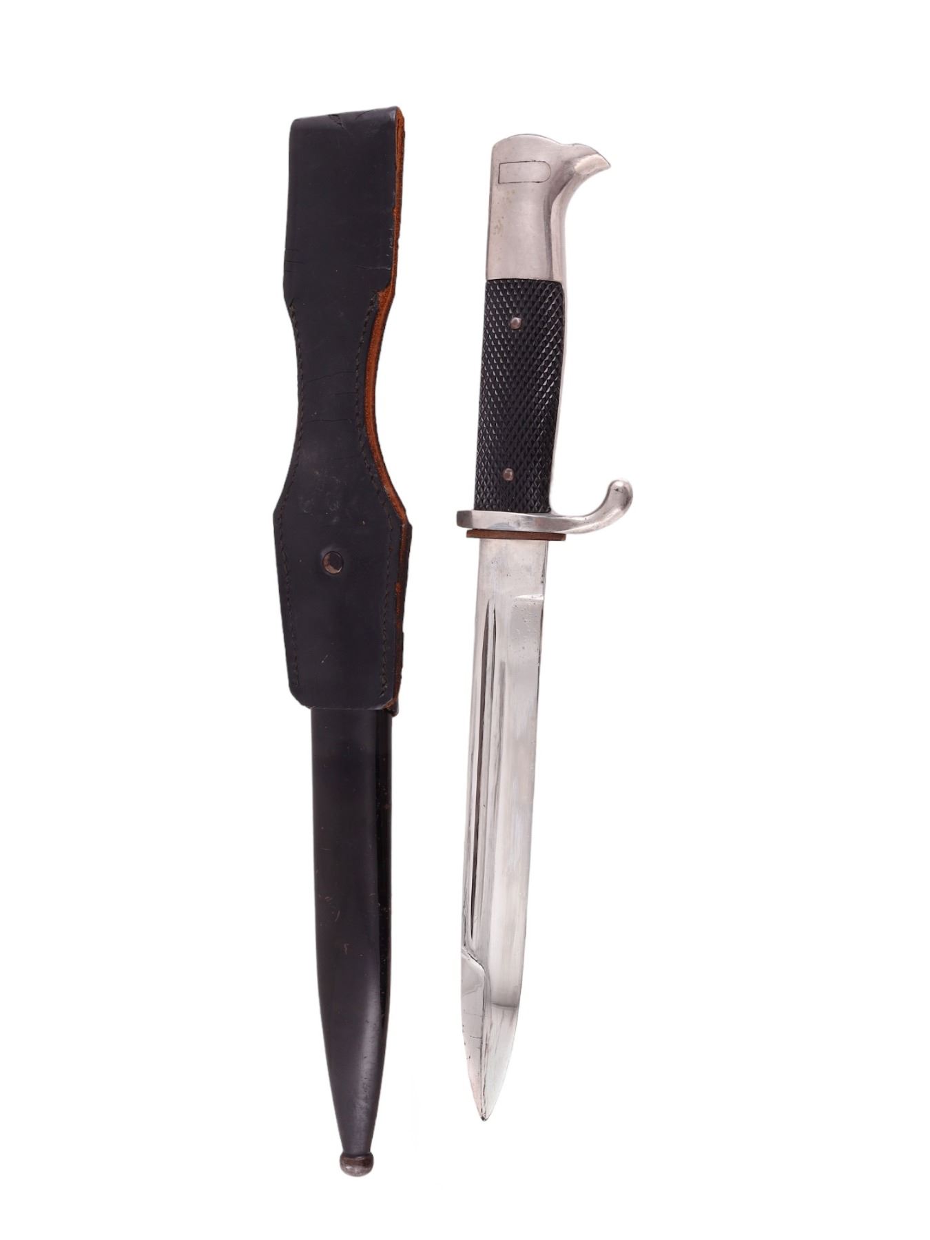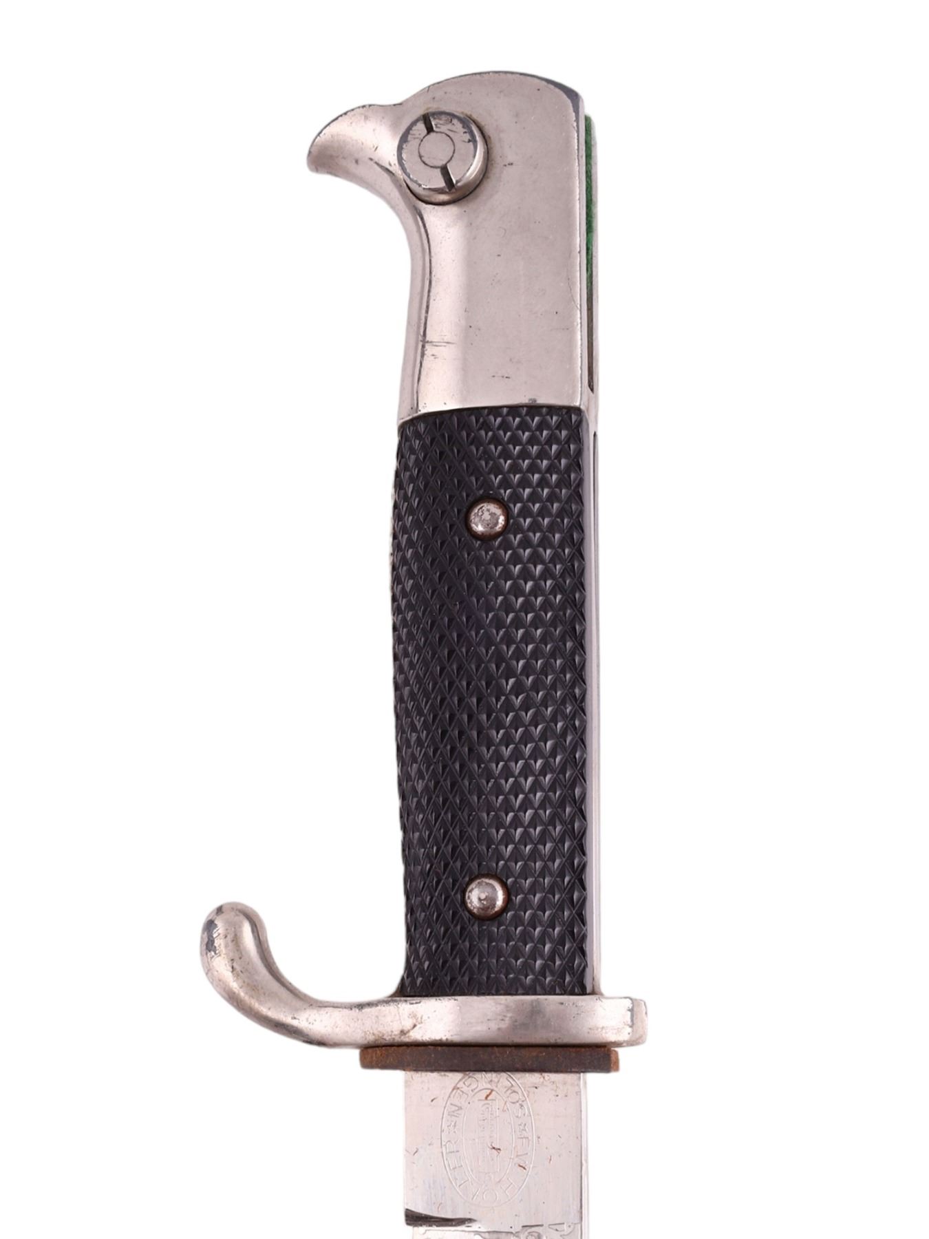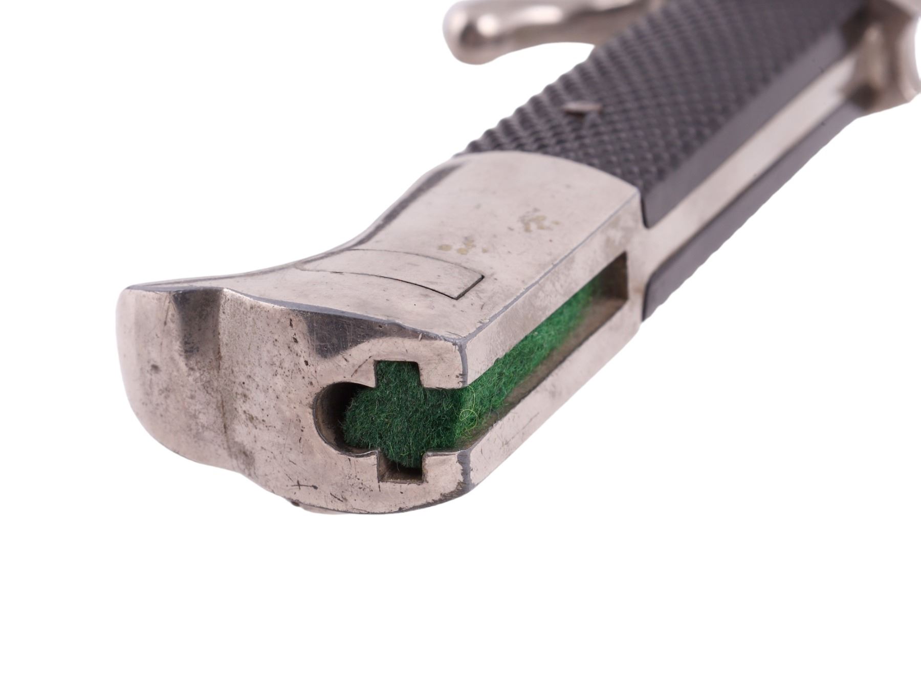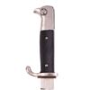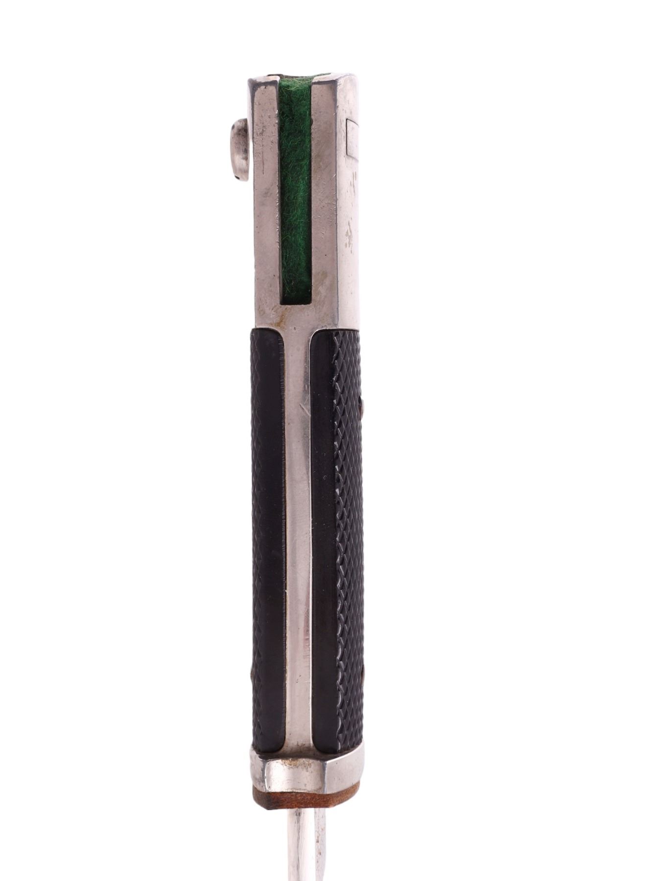 This Nazi German K98 Dress Bayonet is in fantastic shape. The scabbard and the leather frog both exhibit signs of wear consistent with use and age, but the blade is in near mint condition. The blade has a beautiful engraving showing German soldiers and military equipment, as well as the text 'Zur Erinnerung an Meine Dienstzeit' meaning 'As a Reminder of My Time in Service'. The maker's mark attributes this dagger to F.W. Holler of Solingen, and shows their trademark vertical thermometer logo.
