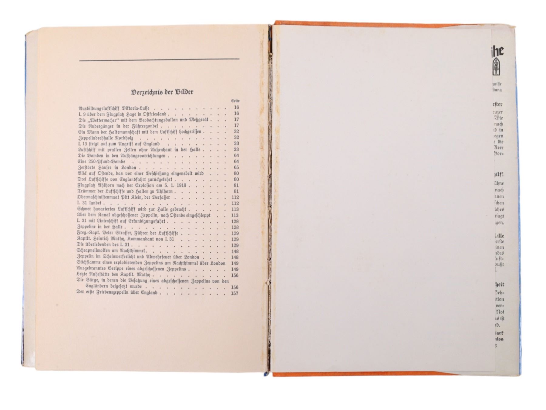 Description: Orange cloth cover with black stamped lettering. Multiple black and white photo plates within. Illustrated dust cover depicting a Zeppelin over London with searchlights scanning the skies.