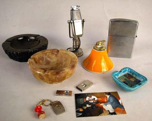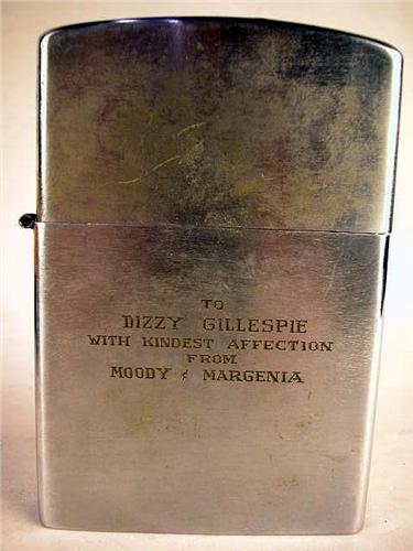 A GIANT SILVERED METAL LIGHTER ENGRAVED ON ONE SIDE, "THE H.N.I.C." And on the reverse side: "To Dizzy Gillespie with Kindest Affection from Moody & Margenia", together with two additional lighters, (one in the form of a microphone), three ashtrays, a photo of Dizzy, with one lighter and ashtray, shaving, and three cigar cutters, 10 pieces
