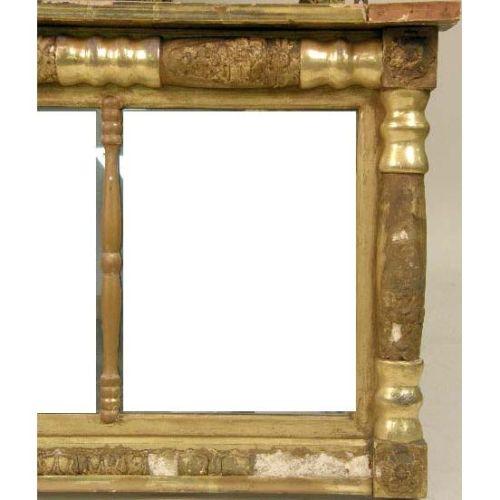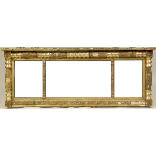 A GILDED AND GOLD-PAINTED HORIZONTAL TRIPARTATE PIER MIRROR<BR><BR>23-1/2"h x 5`1"w x 4"d. Losses to gesso, but some pieces present.