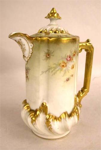 A GILT AND PAINT-DECORATED HOT WATER POT; Retailed by Higgins and Seiter NY 9"h