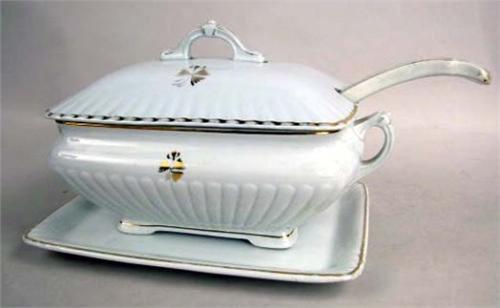 A GILT-DECORATED IRONSTONE TUREEN, UNDERPLATE, AND LADLE