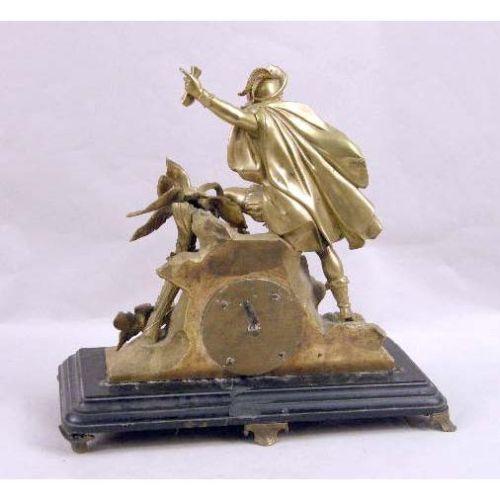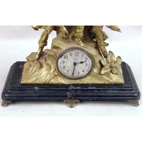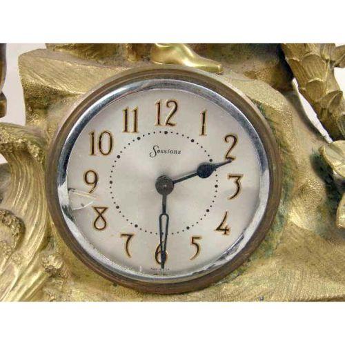 A GILT METAL FIGURAL MANTLE CLOCK<BR><BR>Marked Sessions USA, mounted on a marble base, glass broken on clock face, marble base broken, feet loose, 15"h