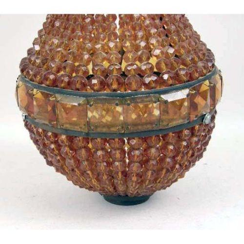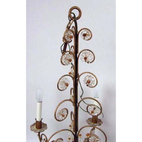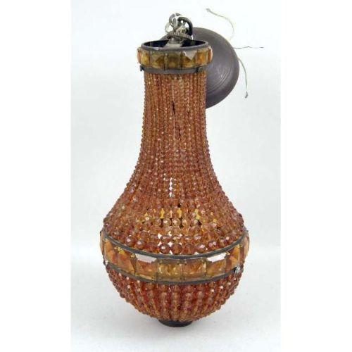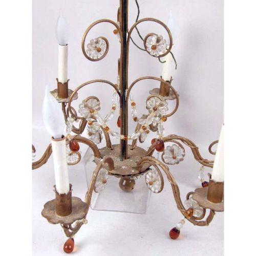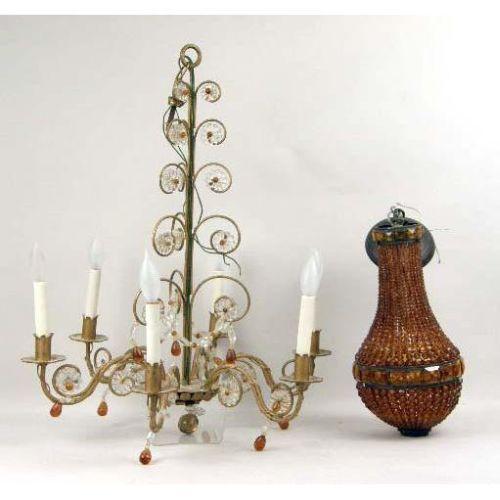 A GILT METAL SIX-ARM CHANDELIER<BR><BR>With colorless and amber glass floral accents. Together with an amber beaded ceiling fixture. 2 pieces