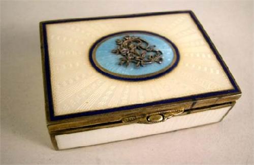 A GILT-SILVER WHITE AND BLUE ENAMELED COSMETIC BOX; The center with applied monogram set with rose diamonds, 2-1/2" x 1-3/4"