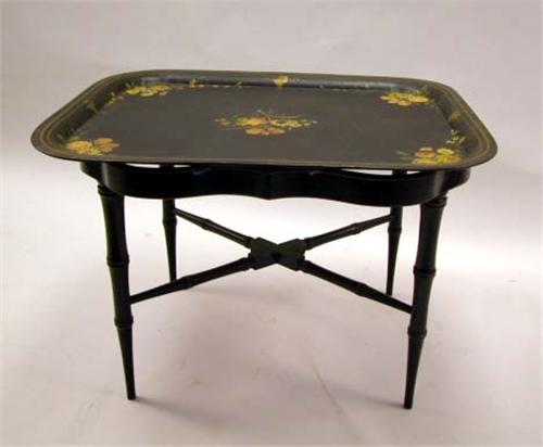 A GILT STENCIL DECORATED TOLE TRAY; Together with a black lacquered bamboo style base, 29" x 23"