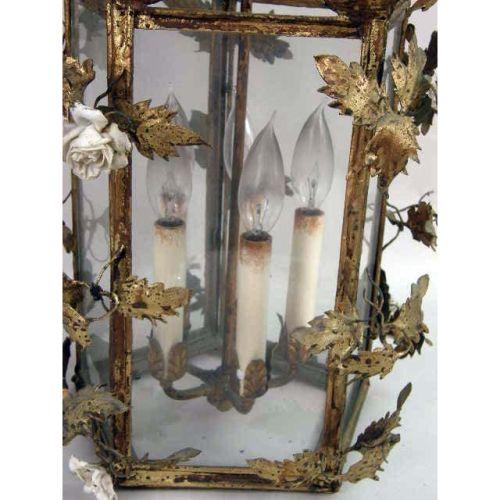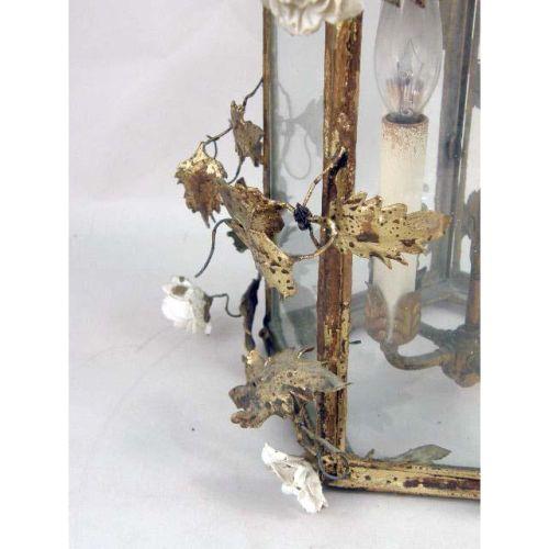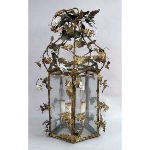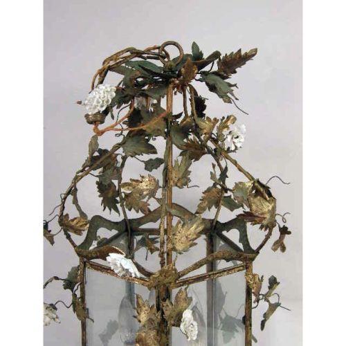 A GILT TOLE LANTERN CHANDELIER<BR><BR>With foliate and white porcelain floral motif, 26"h