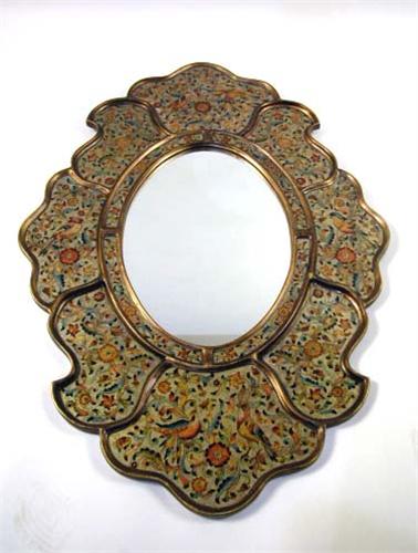 A GILTWOOD EGLOMISE MIRROR; The oval plate within shaped floral-decorated panels 40"h x 28"w