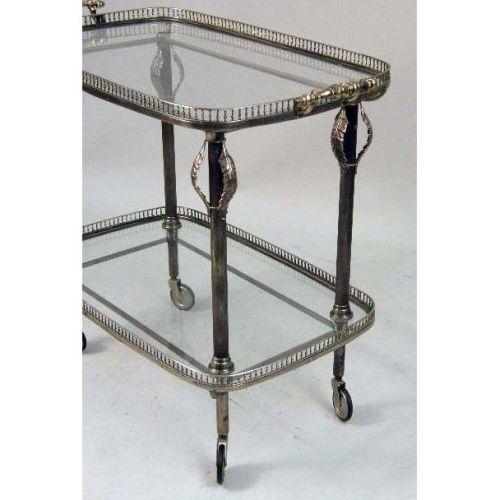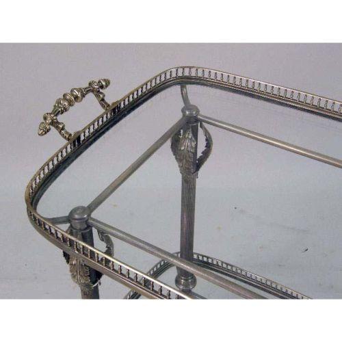 A GLASS TOP SERVING CART<BR><BR>On wheels, with classical metal elements, columns and foliate designs, 31"h x 38"w x 21"d