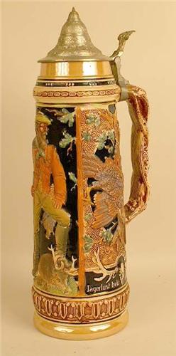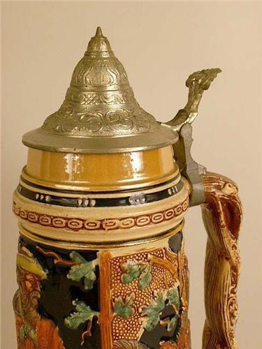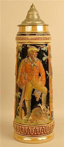 German, with a pewter mounted lid and thumbpiece, 16"h