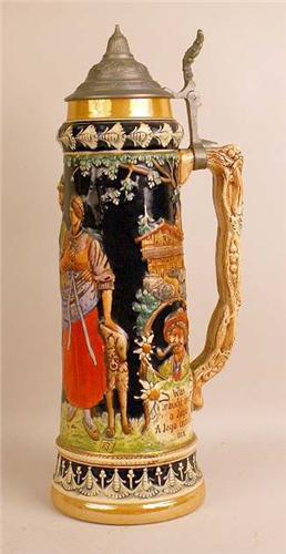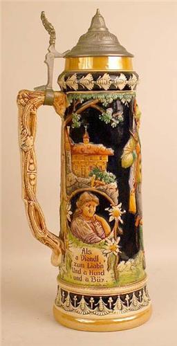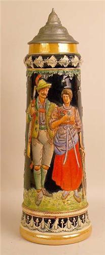German, of impressive size, with hinged pewter lid and thumb piece, 18"h
