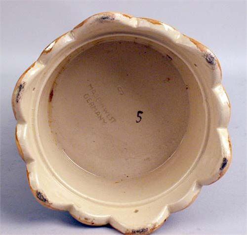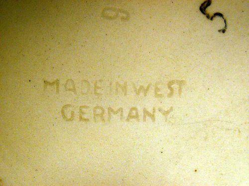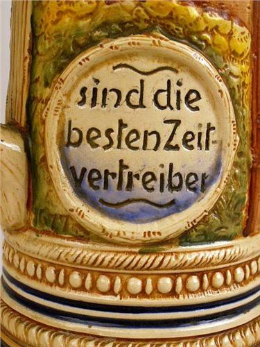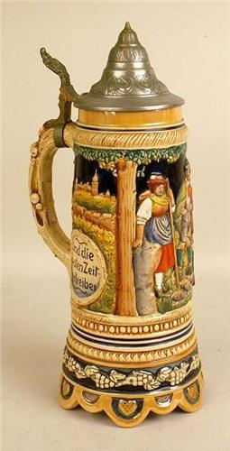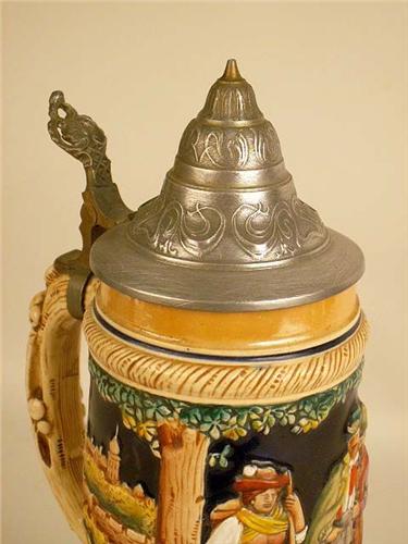 German, in relief with a pewter hinged lid and thumbpiece, the underside marked Made In West Germany, 13"h