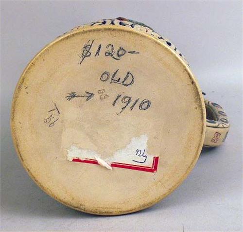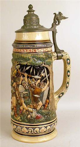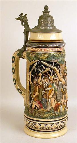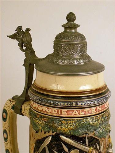 German, in relief with pewter hinged lid and thumbpiece, the underside marked with the number 53, 15 1/2"h