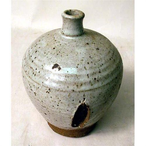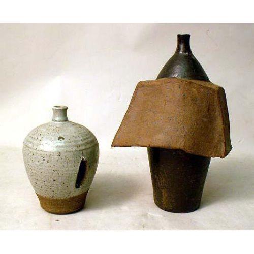 A GLAZED REDWARE "DRAPED" BOTTLE<BR><BR>Inscribed on the underside "DW Jones 68". Together with a small ovoid glazed redware bottle inscribed "DW Jones 72". From 7" to 11"h. 2 pieces.