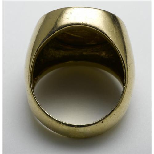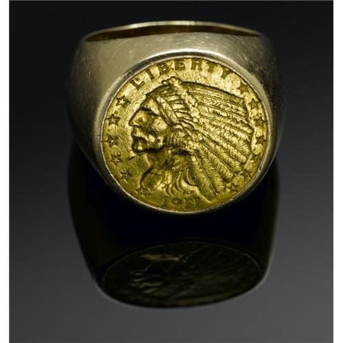 <B>A GOLD COIN MEN'S RING</B></I><BR><BR>The 14k yellow gold men's ring with a 1911 Liberty Indian Five Dollar Coin<BR>