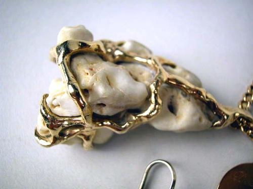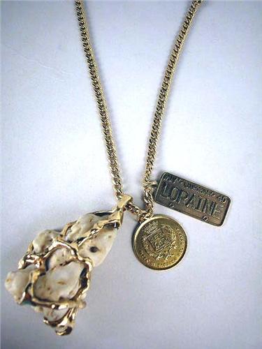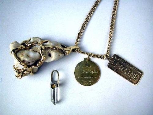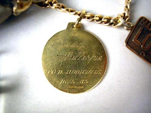 A GOLD NECKLACE WORN BY DIZZY GILLESPIE Comprising a gold chain, a rough crystal stone in gold, a license plate with the name "Lorraine" and engraved "May California 40 Lorraine", a disc engraved "Dizzy Gillespie Containing the following: Amiciria 15-5-85", and a crystal. Together with pictures of Dizzy wearing the necklace