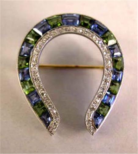 A GOLD SAPPHIRE DIAMOND AND PERIDOT HORSE SHOE PIN; Retailed by Bailey Banks & Biddle, channel-set with 11 rectangular shape small sapphires spaced by 10 peridots the inner border set with 38 small diamonds, estimated weight .38 ct, 1-1/8"h