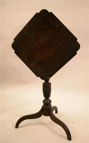 A GOOD CLASSICAL CARVED AND FIGURED MAPLE TILT-TOP CANDLESTAND; New England, the shaped diamond top above a pineapple standard and spider legs, great old surface, 27 1/2"h x 22"w x 21 3/4"d