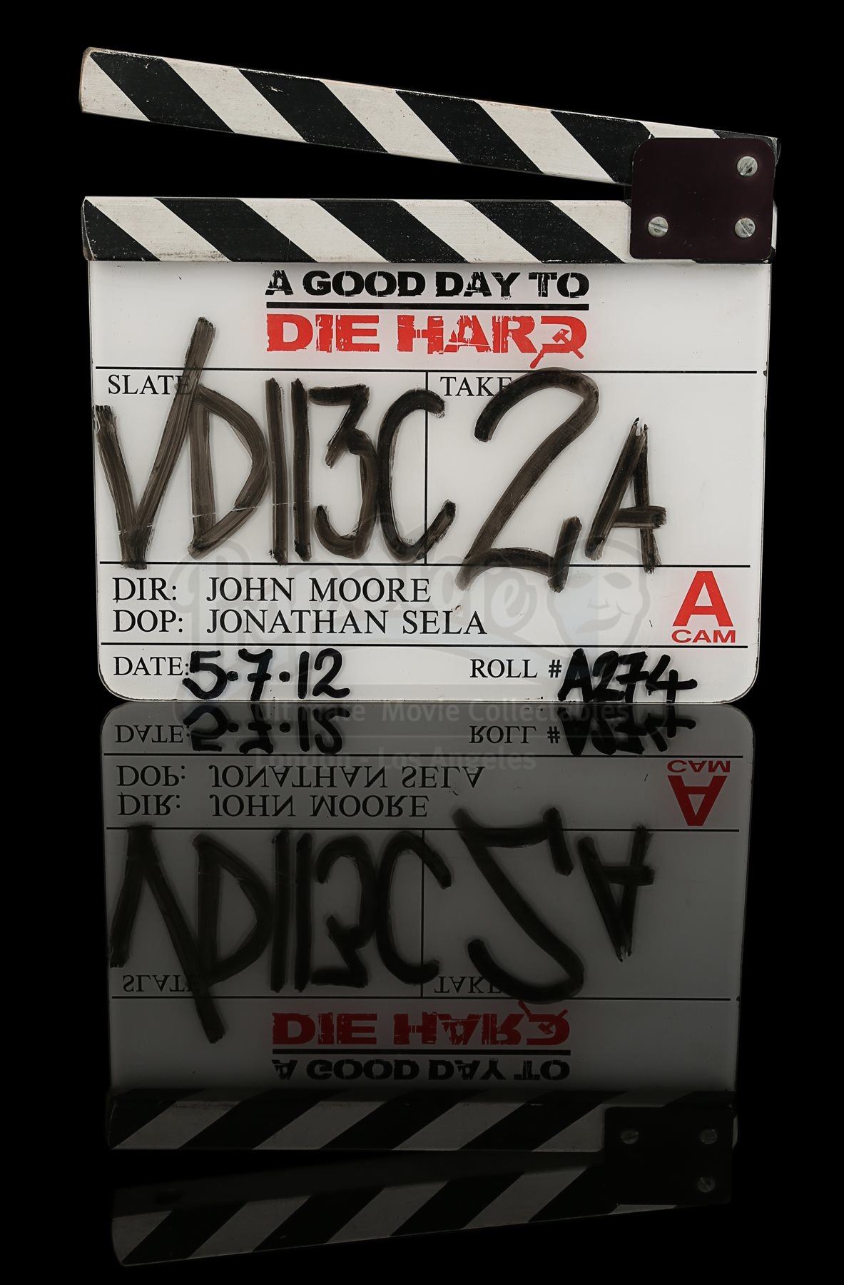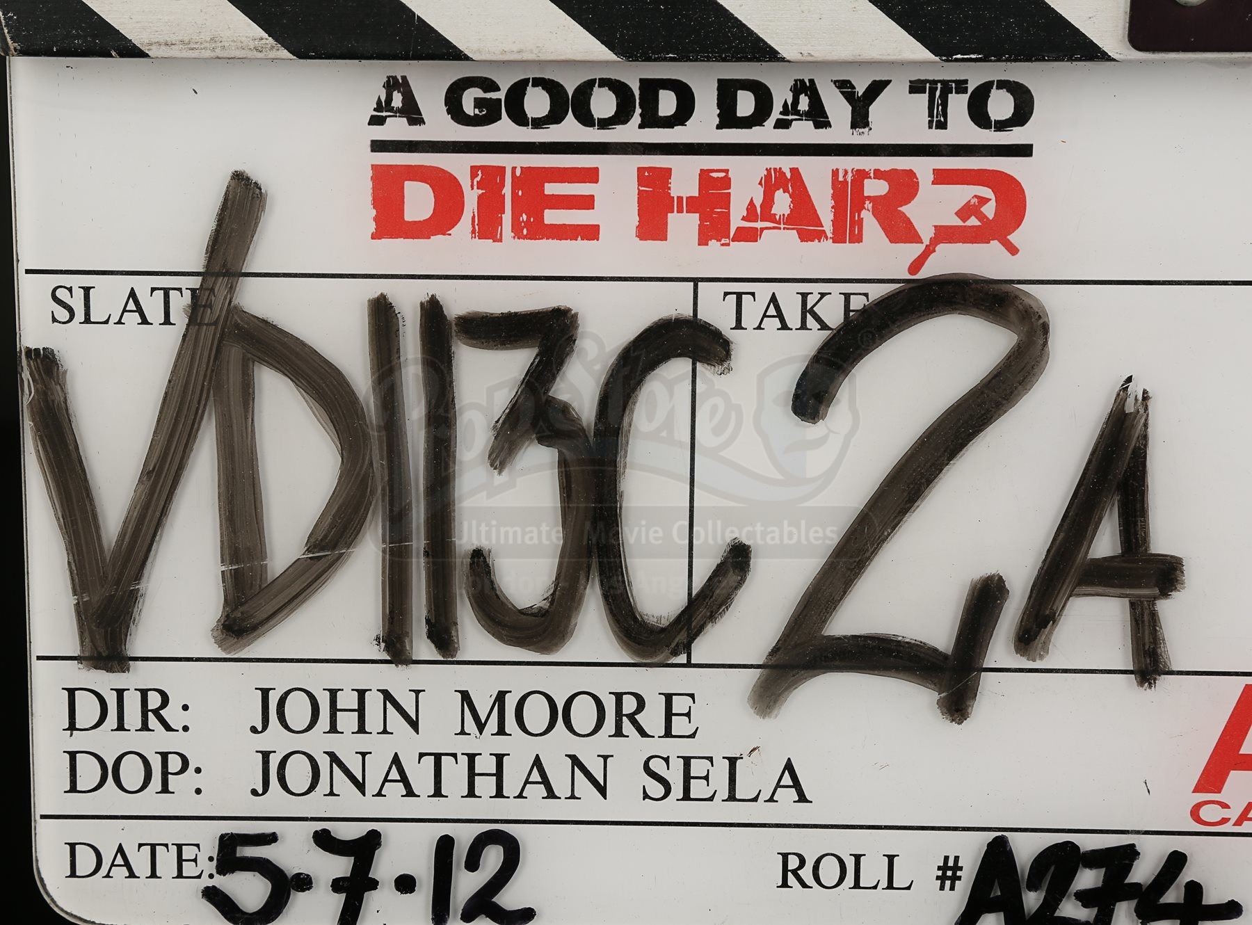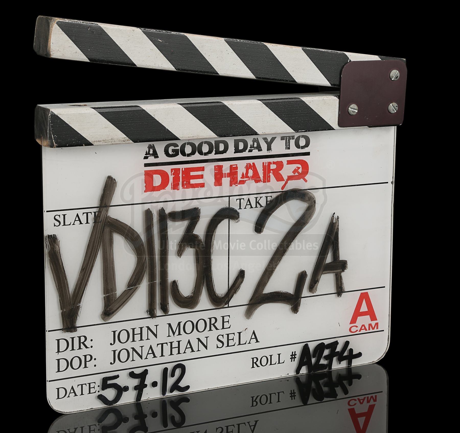 A clapperboard from John Moore’s action thriller A Good Day to Die Hard. Used by the ‘A’ camera unit during filming, the clapperboard consists of an acrylic slate with a wooden clapper fixed on the top and the production title “A Good Day To Die Hard” printed in black and red. The names of director John Moore and Director of Photography Jonathan Sela are printed below. The last date it was used is marked 5 July 2012, written in black ink. Additional fields still feature details written in black. The clapper shows minor wear from use on production, including scuff marks and scratches to the paint on the clapper arm. Dimensions: 4 cm x 28 cm x 24 cm (11” x 9 ½” x 1 ¾”)