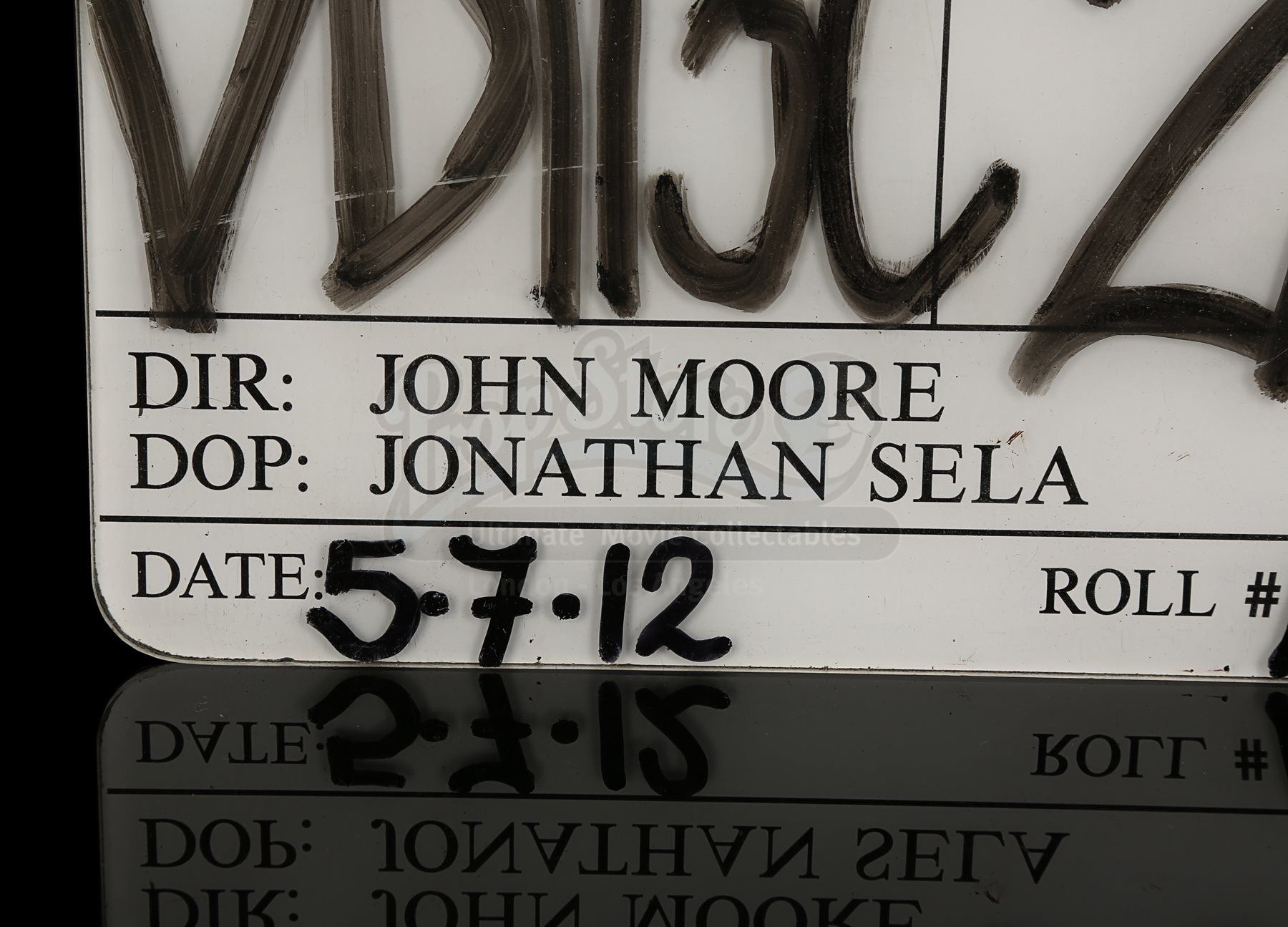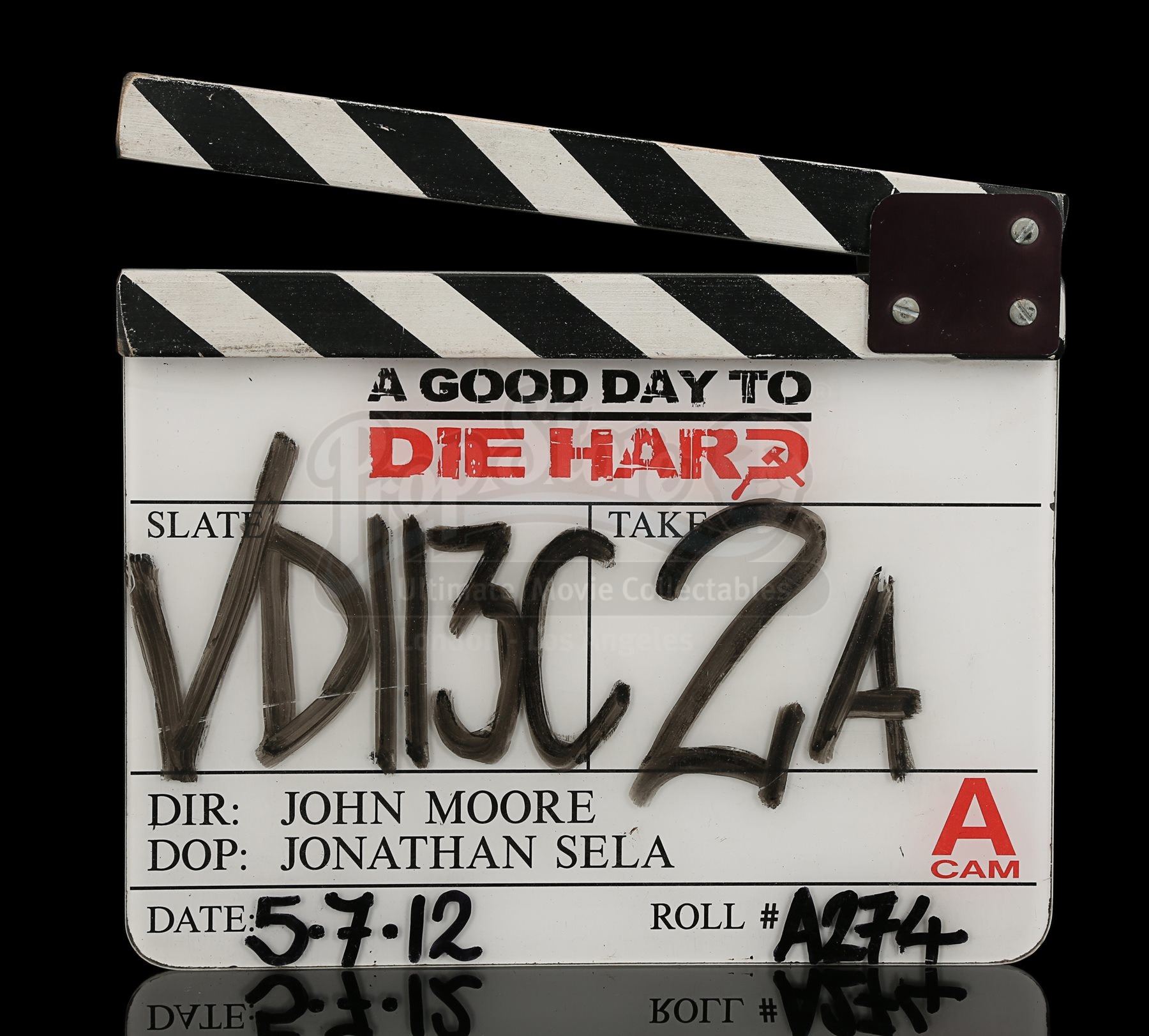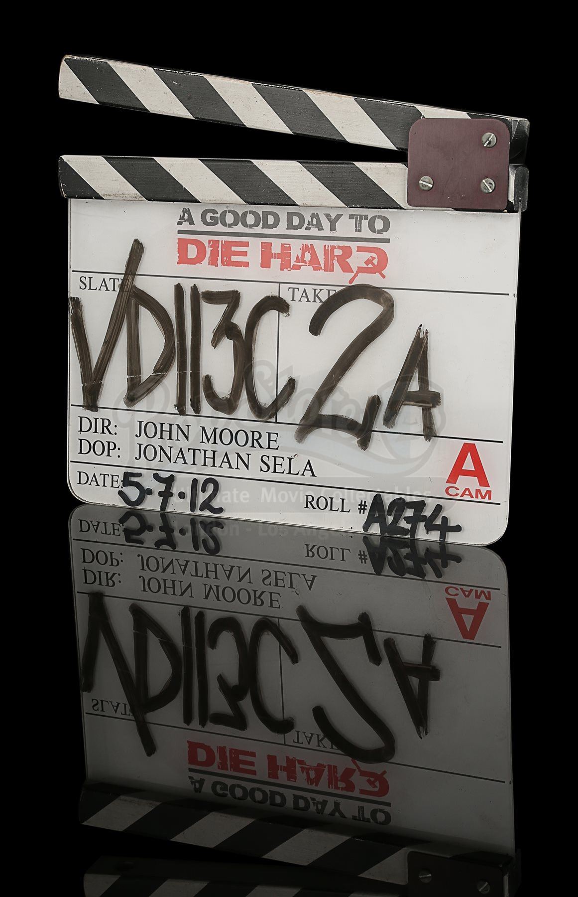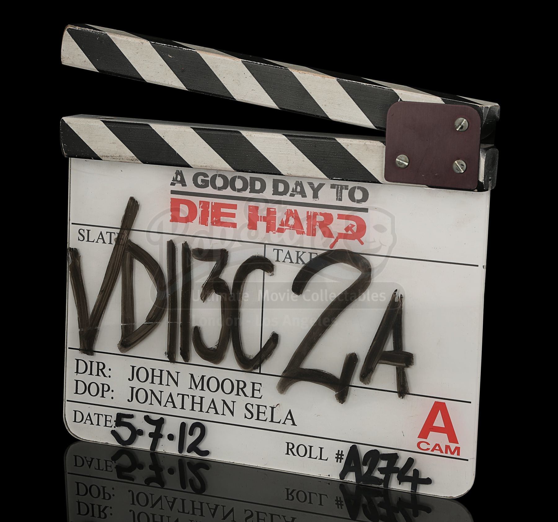 A clapperboard from John Moore’s action thriller A Good Day to Die Hard. Used by the ‘A’ camera unit during filming, the clapperboard consists of an acrylic slate with a wooden clapper fixed on the top and the production title “A Good Day To Die Hard” printed in black and red. The names of director John Moore and Director of Photography Jonathan Sela are printed below. The last date it was used is marked 5 July 2012, written in black ink. Additional fields still feature details written in black. The clapper shows minor wear from use on production, including scuff marks and scratches to the paint on the clapper arm. Dimensions: 4 cm x 28 cm x 24 cm (11” x 9 ½” x 1 ¾”)