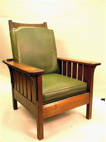 A GOOD OAK MORRIS CHAIR; labeled Stickley Syracuse & Fayetteville, NY